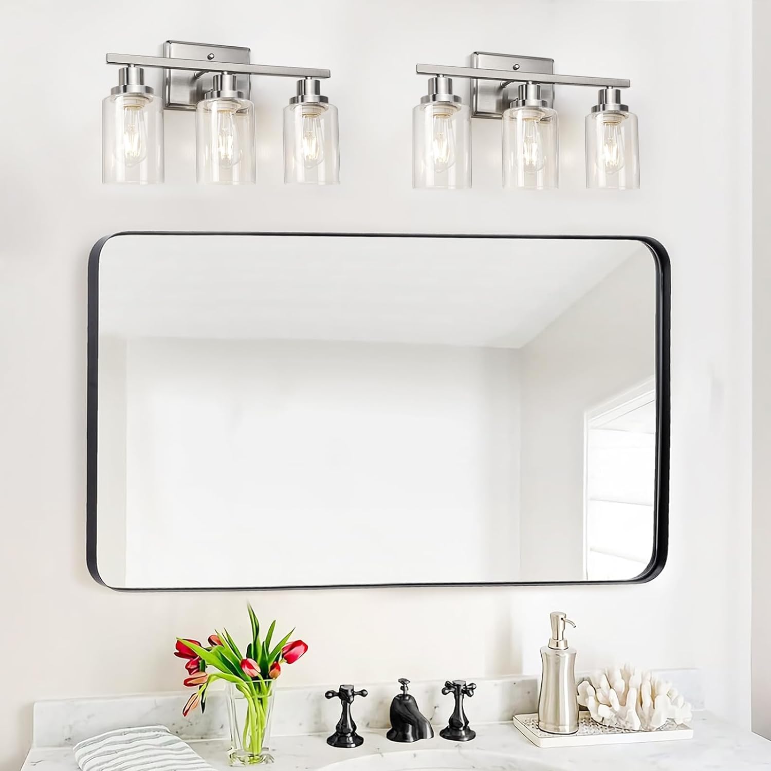The Ascher Bathroom Vanity Light Fixtures are a stylish and functional addition to any space in your home. With a sleek brushed nickel finish and clear glass shades, these wall sconces provide ample light for your bathroom, kitchen, living room, or gallery. The E26 base allows for easy installation, and the bulbs are not included, giving you the flexibility to choose the perfect brightness for your needs. Elevate your home decor with the Ascher Bathroom Vanity Light Fixtures today.
